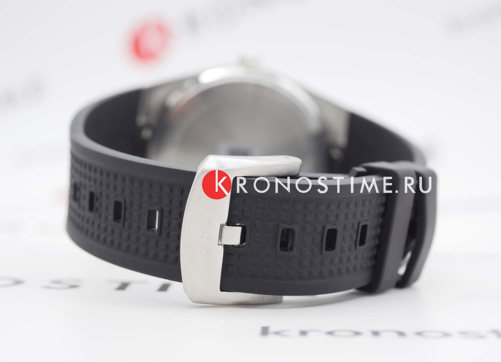 Корпус часов изготовлен из нержавеющей стали марки 316 серебристого цвета. Устойчивое к появлению царапин сапфировое стеклоСапфировое стеклоПрочный и надёжный материал из кристалла сапфира синтетического происхождения, характеризующийся особой твёрдостью и устойчивостью к царапинам и повреждениям. с антибликовым покрытием. Класс водозащиты: 100 метров, позволит плавать, нырять и заниматься другими водными видами спорта. Стрелки и метки покрыты люминесцентным покрытиемЛюминесцентное покрытиеПозволяет считывать показания времени в темноте. Производители наносят на стрелки, часовые индексы, безель или поверхность циферблата светонакопительный состав, дающий холодное свечение. Силиконовый ремешок черного цвета с классической застежкой.