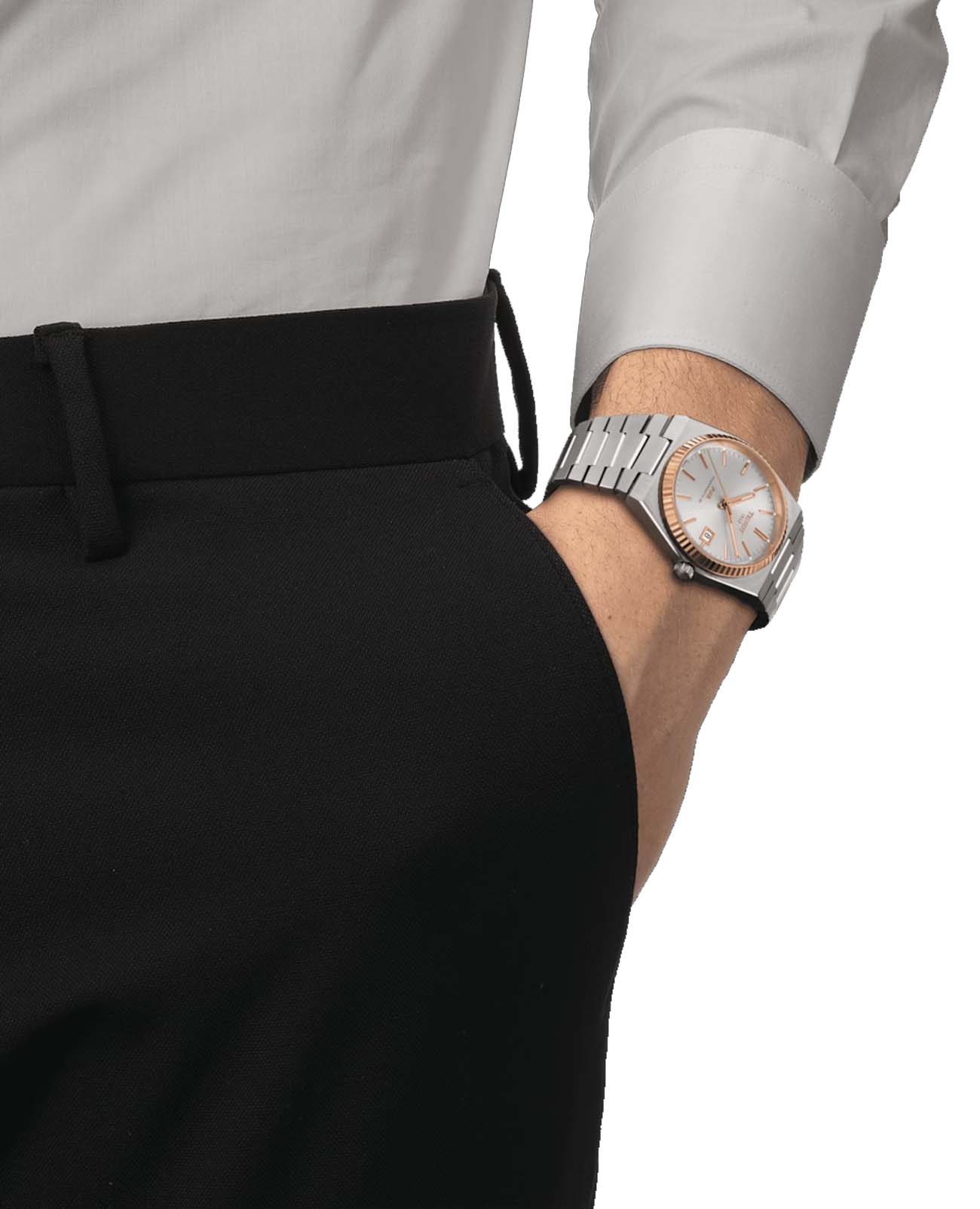 Часы Tissot PRX Powermatic 80 T931.407.41.291.00 Steel & 18k Gold поставляются с браслетом из нержавеющей стали. Браслет серебристого цвета с застежкой "бабочка" с кнопками для расстегивания браслета.