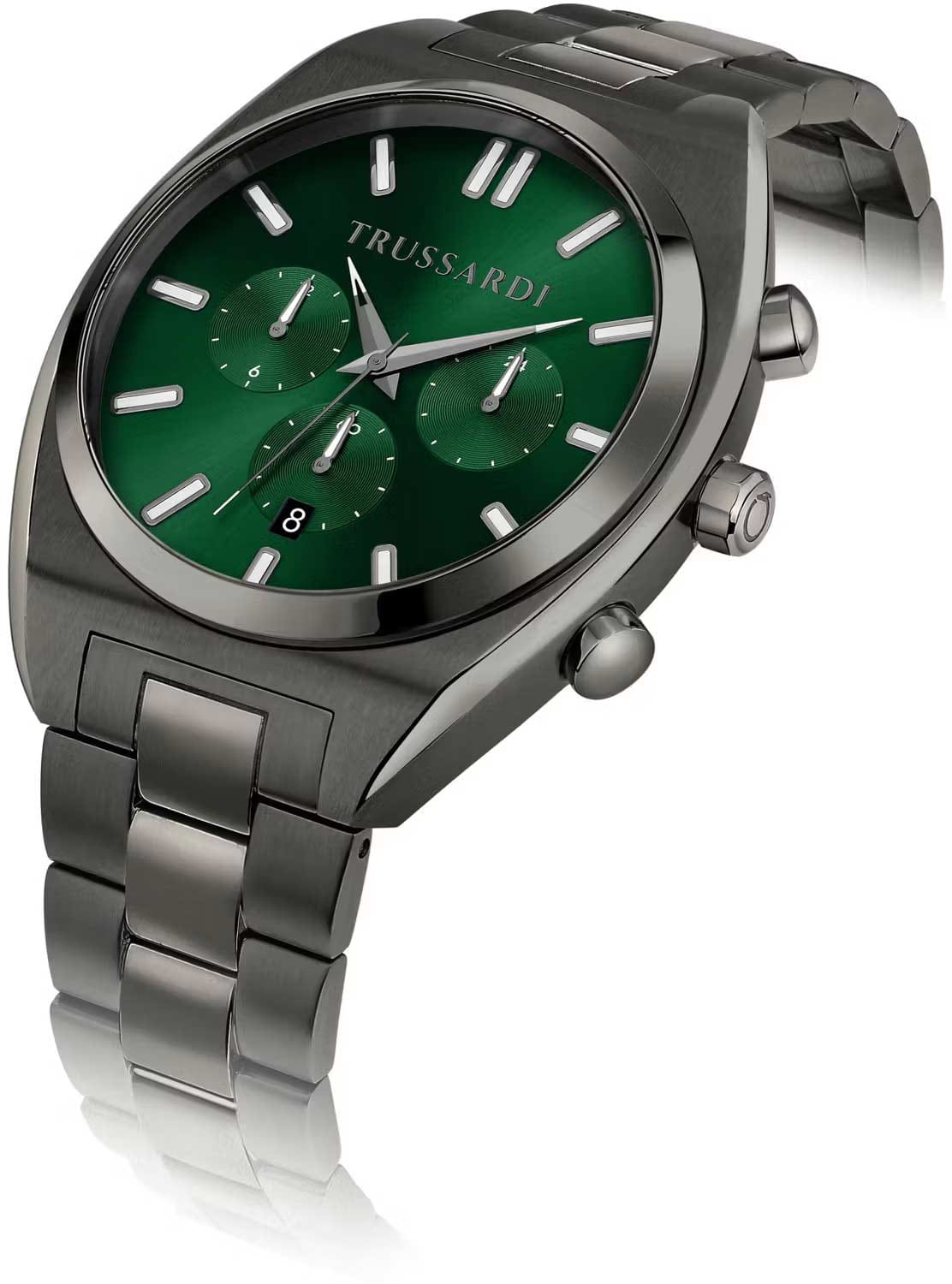 Итальянские мужские часы Trussardi Metropolitan R2453159001- это стильный мужской аксессуар, который сочетает элегантный дизайн и практичность. Корпус выполнен из нержавеющей стали с IP-покрытиемIP-покрытиеМетод ионного напыления. Демонстрирует повышенную устойчивость к истиранию, окислению и химическим веществам. Под воздействием высокого давления и температуры около 1500°C молекулы металла надёжно соединяются с частицами корпуса часов., что обеспечивает долговечность и утончённый внешний вид. Надежное минеральное стеклоМинеральное стеклоМинеральное стекло представляет собой искусственно выращенный минерал кварца. Такое стекло отличается особой устойчивостью к повреждениям и царапинам. Уступает по некоторым качествам сапфировому стеклу. защищает циферблат от царапин и обеспечивает долговечность. Модель оснащена кварцевым механизмом, обеспечивающим высокую точность хода. Браслет из нержавеющей стали с IP-покрытиемIP-покрытиеМетод ионного напыления. Демонстрирует повышенную устойчивость к истиранию, окислению и химическим веществам. Под воздействием высокого давления и температуры около 1500°C молекулы металла надёжно соединяются с частицами корпуса часов.  с раскладной застёжкойРаскладная застёжкаТакой тип застёжки используется только на браслетах из металла. Она никогда не раскрывается полностью, происходит разделение на 2 и более частей. Раскладывающая застёжка снизит вероятность потери часов к минимуму. обеспечивает комфортное ношение. Водозащита 50 метров позволит защитить корпус от случайных брызг или капель дождя. Вынесенный циферблат с 24-х и 12-ти часовым указателем времени, а также вынесенный циферблат c хронографомХронографФункция позволяет измерять отрезки времени с особой точностью: часы, минуты, секунды. Верным признаком хронографа является наличие на циферблате 3 дополнительных окошек-счётчиков.. Окошко даты находится в положении 6 часов. Стрелки и метки оснащены люминесцентным покрытиемЛюминесцентное покрытиеПозволяет считывать показания времени в темноте. Производители наносят на стрелки, часовые индексы, безель или поверхность циферблата светонакопительный состав, дающий холодное свечение., обеспечивающим отличную видимость даже при слабом освещении. Эта модель – отличный выбор для тех, кто ищет сочетание стиля, качества и функциональности. Часы станут не только полезным аксессуаром, но и выразительным элементом вашего имиджа.
