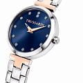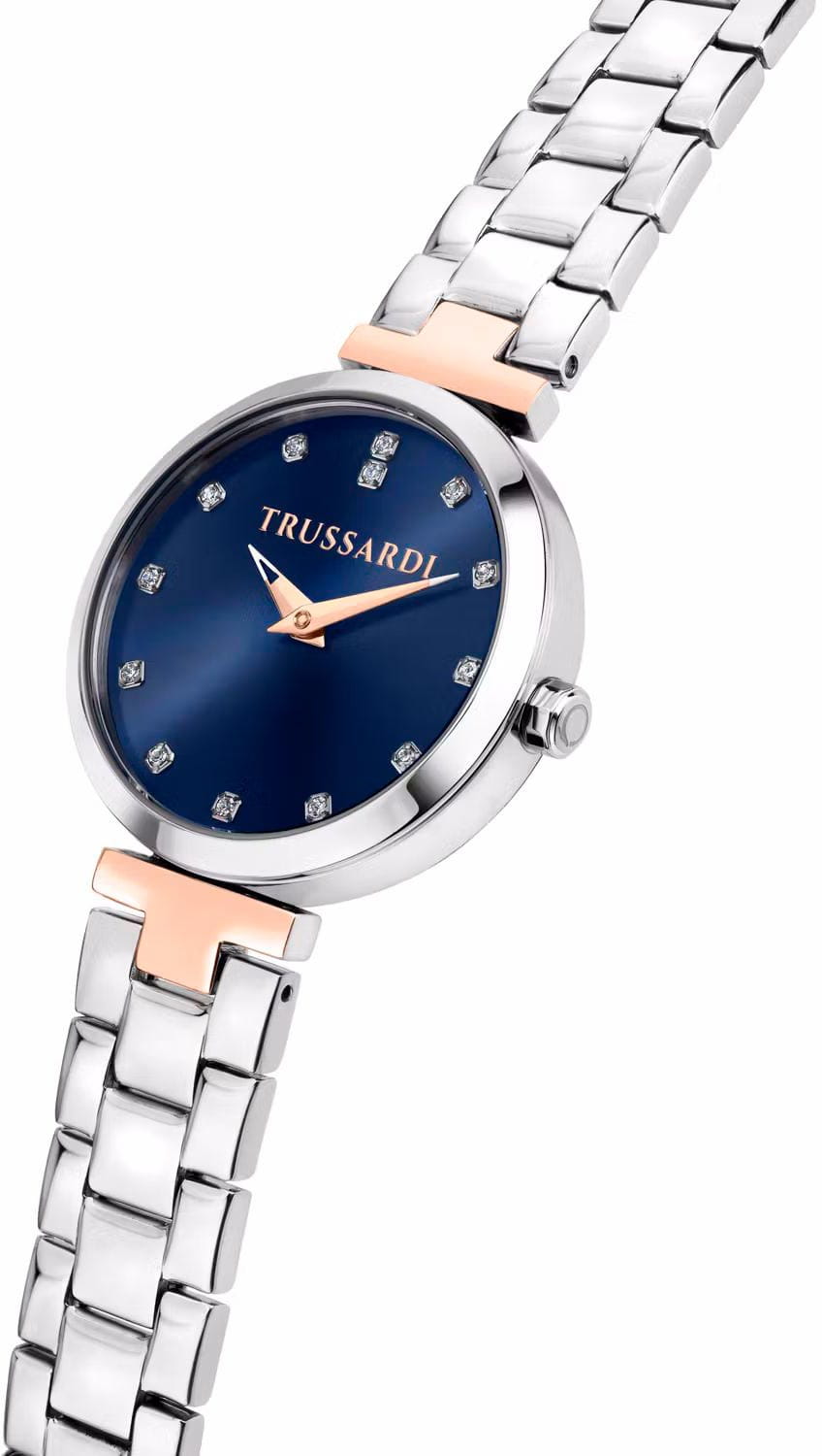 Итальянские женские часы Trussardi Loud R2453164504 - это стильный женский аксессуар, который сочетает элегантный дизайн и практичность. Корпус выполнен из нержавеющей стали, что обеспечивает долговечность и утончённый внешний вид. Надежное минеральное стеклоМинеральное стеклоМинеральное стекло представляет собой искусственно выращенный минерал кварца. Такое стекло отличается особой устойчивостью к повреждениям и царапинам. Уступает по некоторым качествам сапфировому стеклу. защищает циферблат с кристаллами от царапин и обеспечивает долговечность. Модель оснащена кварцевым механизмом, обеспечивающим высокую точность хода. Браслет из нержавеющей стали с частичным IP-покрытиемIP-покрытиеМетод ионного напыления. Демонстрирует повышенную устойчивость к истиранию, окислению и химическим веществам. Под воздействием высокого давления и температуры около 1500°C молекулы металла надёжно соединяются с частицами корпуса часов. на раскладной застёжкеРаскладная застёжкаТакой тип застёжки используется только на браслетах из металла. Она никогда не раскрывается полностью, происходит разделение на 2 и более частей. Раскладывающая застёжка снизит вероятность потери часов к минимуму. обеспечивает комфортное ношение. Стрелки оснащены люминесцентным покрытиемЛюминесцентное покрытиеПозволяет считывать показания времени в темноте. Производители наносят на стрелки, часовые индексы, безель или поверхность циферблата светонакопительный состав, дающий холодное свечение., обеспечивающим отличную видимость даже при слабом освещении. Водозащита 50 метров позволит защитить корпус от случайных брызг или капель дождя. Эта модель – отличный выбор для тех, кто ищет сочетание стиля, качества и функциональности. Часы станут не только полезным аксессуаром, но и выразительным элементом вашего имиджа.