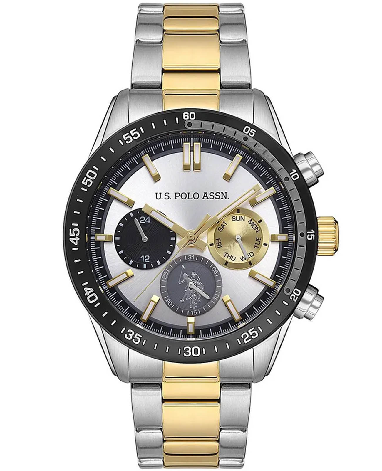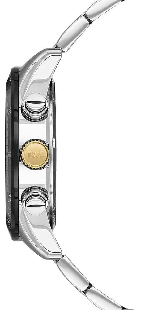 Мужские часы U.S. Polo Assn. Fundamental USPA1044-05, кварцевый механизм с высокой точностью. Минеральное стеклоМинеральное стеклоМинеральное стекло представляет собой искусственно выращенный минерал кварца. Такое стекло отличается особой устойчивостью к повреждениям и царапинам. Уступает по некоторым качествам сапфировому стеклу. устойчивое к появлению царапин, обладающее высокой прозрачностью. Центральные часовая, минутная и секундная стрелки. Индикация даты и дня недели. 12/24х часовой формат времени. Корпус изготовлен из нержавеющей стали. Класс водозащиты: 50 метров, позволит защитить корпус от случайных брызг или капель дождя. Стальной браслет на раскладной застёжкеРаскладная застёжкаТакой тип застёжки используется только на браслетах из металла. Она никогда не раскрывается полностью, происходит разделение на 2 и более частей. Раскладывающая застёжка снизит вероятность потери часов к минимуму.  с IP-покрытиемIP-покрытиеМетод ионного напыления. Демонстрирует повышенную устойчивость к истиранию, окислению и химическим веществам. Под воздействием высокого давления и температуры около 1500°C молекулы металла надёжно соединяются с частицами корпуса часов.. Стрелки с люминесцентным покрытиемЛюминесцентное покрытиеПозволяет считывать показания времени в темноте. Производители наносят на стрелки, часовые индексы, безель или поверхность циферблата светонакопительный состав, дающий холодное свечение.. БезельБезельВнешний ободок, закрепляющий стекло. В спортивных часах так называется поворотное кольцо с делениями на циферблате, выполняет роль таймера – замеряет отрезки времени на шкале. Неподвижный безель – элемент декора. Однонаправленно вращающийся безель на дайверских часах позволяет фиксировать моменты погружения и выныривания на поверхность. с IP-покрытиемIP-покрытиеМетод ионного напыления. Демонстрирует повышенную устойчивость к истиранию, окислению и химическим веществам. Под воздействием высокого давления и температуры около 1500°C молекулы металла надёжно соединяются с частицами корпуса часов..