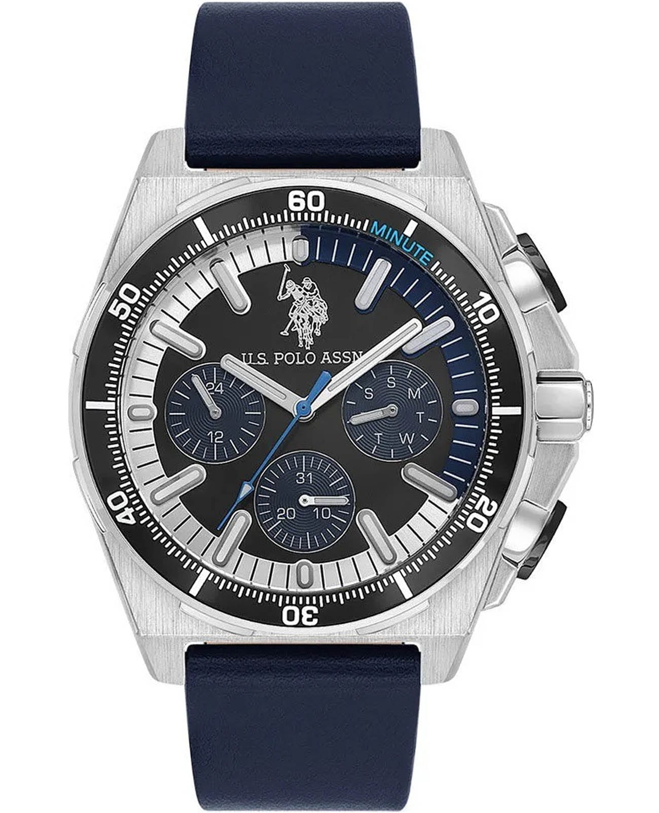 Мужские элегантные американские часы U.S. Polo Assn. Crossing USPA1092-02 обладают кварцевым механизмом с высокой точностью. Минеральное стеклоМинеральное стеклоМинеральное стекло представляет собой искусственно выращенный минерал кварца. Такое стекло отличается особой устойчивостью к повреждениям и царапинам. Уступает по некоторым качествам сапфировому стеклу. устойчивое к появлению царапин, обладающее высокой прозрачностью. Изысканный корпус изготовлен из нержавеющей стали с безелемБезельВнешний ободок, закрепляющий стекло. В спортивных часах так называется поворотное кольцо с делениями на циферблате, выполняет роль таймера – замеряет отрезки времени на шкале. Неподвижный безель – элемент декора. Однонаправленно вращающийся безель на дайверских часах позволяет фиксировать моменты погружения и выныривания на поверхность. с PVD-покрытиемPVDУльтратонкое покрытие наносится в технике вакуумного напыления, сочетает в себе нитрид титана особой прочности со слоем золота или оксида хрома. Несёт в себе декоративную или защитную функцию.. Стильные центральные часовая, минутная и секундная стрелки. Дата и день недели, 24х часовой формат времени вынесены на отдельный циферблат. Часы оснащены люминесцентным покрытиемЛюминесцентное покрытиеПозволяет считывать показания времени в темноте. Производители наносят на стрелки, часовые индексы, безель или поверхность циферблата светонакопительный состав, дающий холодное свечение., обеспечивающим хорошую читаемость в темноте. Класс водозащиты: 50 метров, позволит защитить корпус от случайных брызг или капель дождя. Кожаный ремень со стандартной застежкой обеспечивает комфорт и удобство в использовании, добавляя завершающий штрих к этому стильному и высокоэффективному аксессуару. Это практичный и стильный инструмент для активной повседневности, объединяющий точный механизм и удобство.