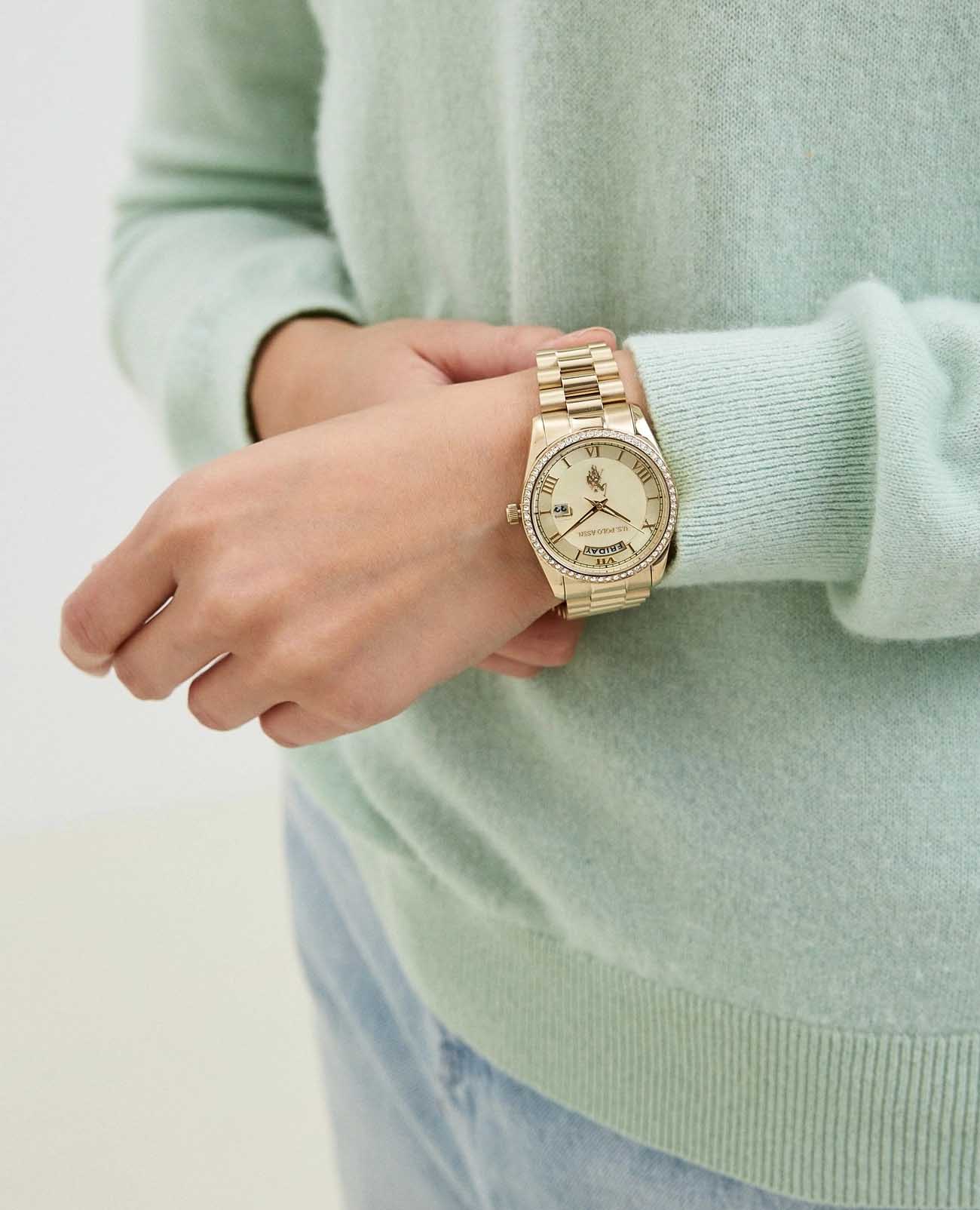 Женские часы U.S. Polo Assn Stile USPA2054-08, кварцевый механизм с высокой точностью. Минеральное стеклоМинеральное стеклоМинеральное стекло представляет собой искусственно выращенный минерал кварца. Такое стекло отличается особой устойчивостью к повреждениям и царапинам. Уступает по некоторым качествам сапфировому стеклу. устойчивое к появлению царапин, обладающее высокой прозрачностью. Корпус изготовлен из нержавеющей стали с IP-покрытиемIP-покрытиеМетод ионного напыления. Демонстрирует повышенную устойчивость к истиранию, окислению и химическим веществам. Под воздействием высокого давления и температуры около 1500°C молекулы металла надёжно соединяются с частицами корпуса часов.. БезельБезельВнешний ободок, закрепляющий стекло. В спортивных часах так называется поворотное кольцо с делениями на циферблате, выполняет роль таймера – замеряет отрезки времени на шкале. Неподвижный безель – элемент декора. Однонаправленно вращающийся безель на дайверских часах позволяет фиксировать моменты погружения и выныривания на поверхность. украшен кристаллами. Окошко даты находится в положении 3 часа. Класс водозащиты: 30 метров, позволит защитить корпус от случайных брызг или капель дождя. Стальной браслет с IP-покрытиемIP-покрытиеМетод ионного напыления. Демонстрирует повышенную устойчивость к истиранию, окислению и химическим веществам. Под воздействием высокого давления и температуры около 1500°C молекулы металла надёжно соединяются с частицами корпуса часов. на застёжке-бабочке с кнопкамиЗастёжка "бабочка"Такой вид застёжки дополняется предохранителями, помогающими избежать случайного раскрытия браслета. Обладают изящным исполнением. .