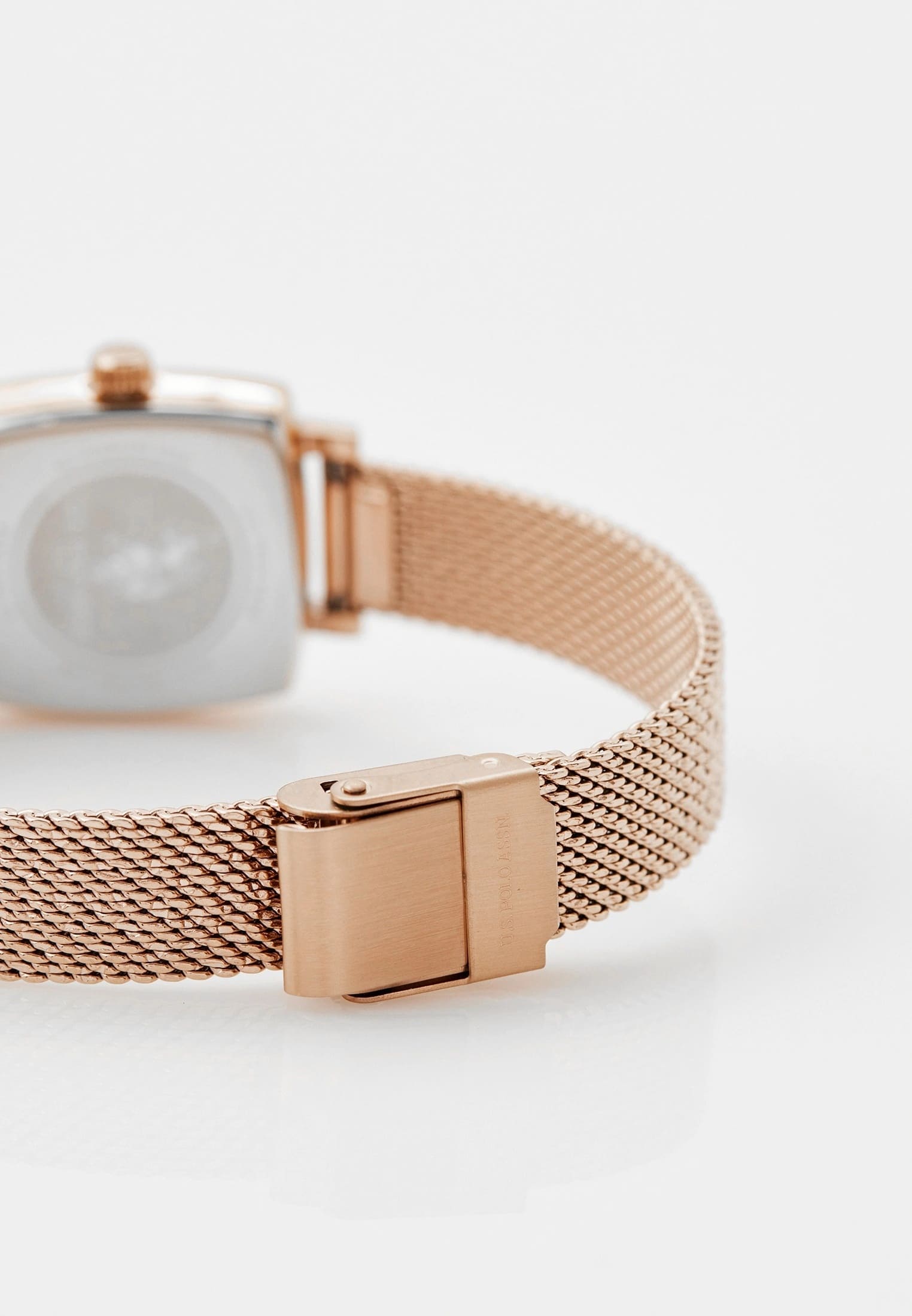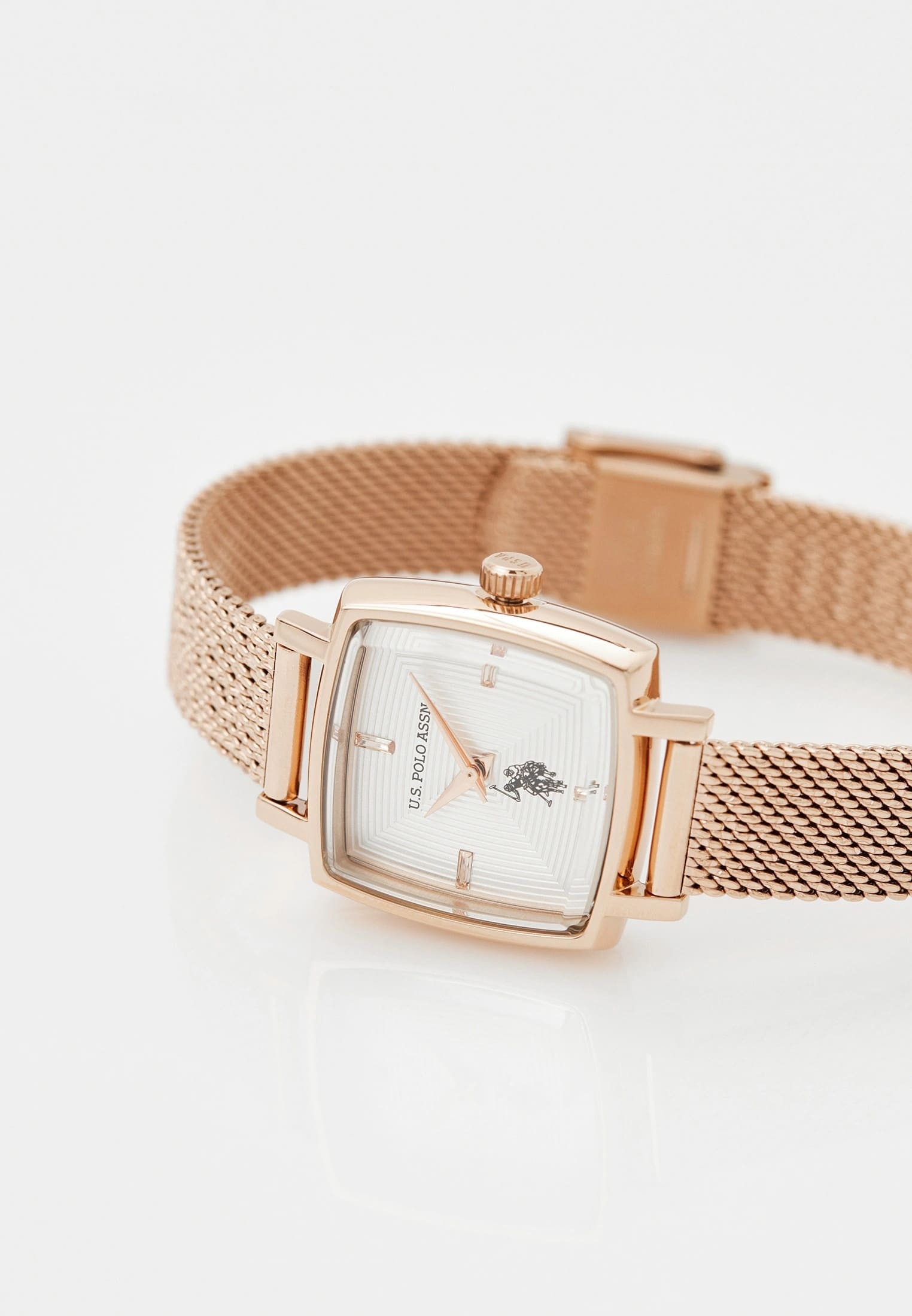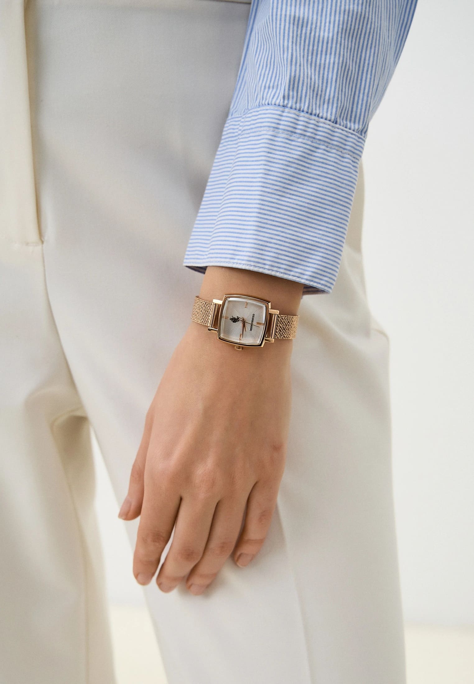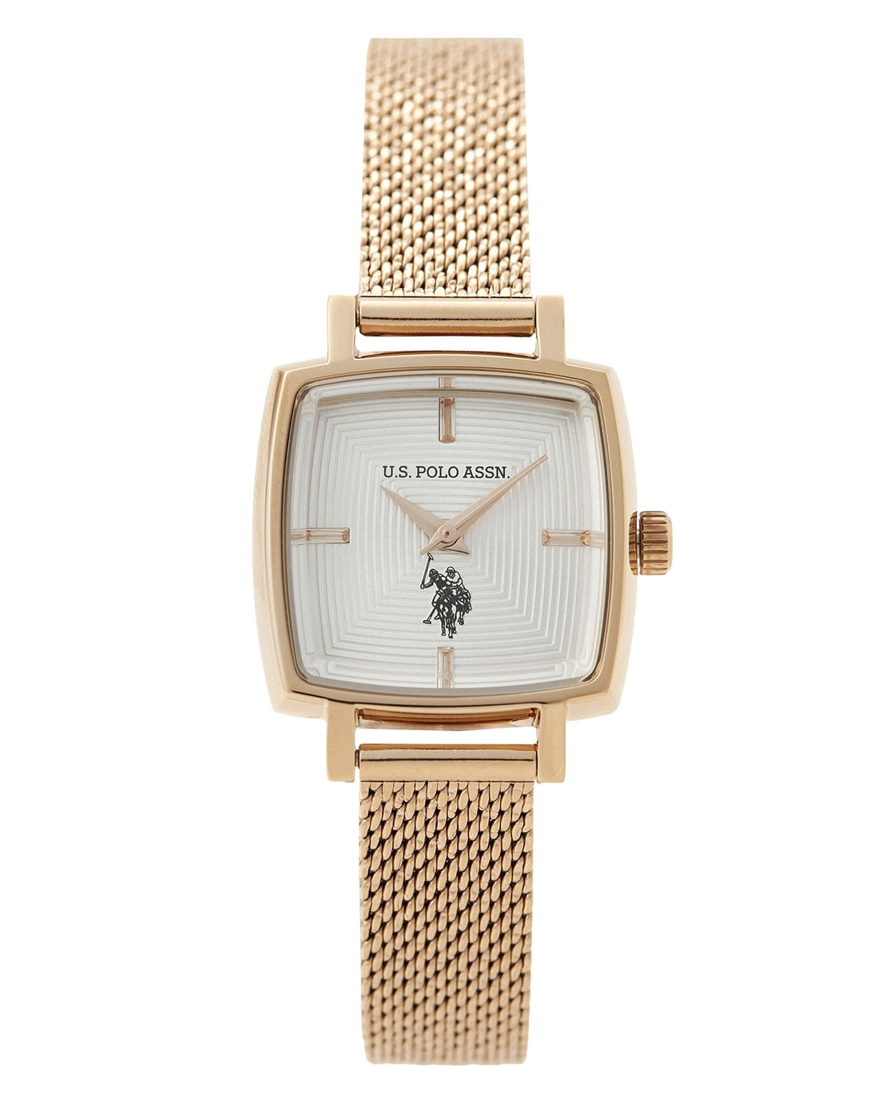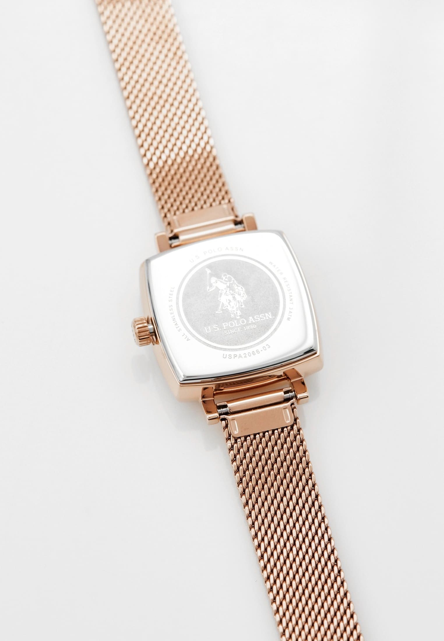 Женские наручные часы U.S. Polo Assn. Stile USPA2066-03 — это стильный и лаконичный аксессуар, выполненный в форме квадрата. Модель изготовлена из стали с PVD-покрытиемPVDУльтратонкое покрытие наносится в технике вакуумного напыления, сочетает в себе нитрид титана особой прочности со слоем золота или оксида хрома. Несёт в себе декоративную или защитную функцию. цвета розового золота, что придаёт ей благородный внешний вид и устойчивость к царапинам. Циферблат белого цвета дополнен секундной стрелкой, обеспечивающей точность отсчёта времени. Защиту циферблата обеспечивает минеральное стеклоМинеральное стеклоМинеральное стекло представляет собой искусственно выращенный минерал кварца. Такое стекло отличается особой устойчивостью к повреждениям и царапинам. Уступает по некоторым качествам сапфировому стеклу., устойчивое к мелким повреждениям. Часы оснащены кварцевым механизмом, гарантирующим точность и минимальное обслуживание. Водонепроницаемость 3 АТМ позволяет использовать часы в повседневных условиях — при мытье рук или под лёгким дождём. Браслет выполнен в технике миланской сетки из стали с покрытием розового золота и оснащён раскладным замкомРаскладной замокДанный вариант застежки используется только на часах с металлическим браслетом. Отличительная особенность такого крепления в том, что длина браслета становится универсальной и вы можете самостоятельно отрегулировать нужный вам размер – застежка просто двигается по браслету часов., обеспечивающей комфорт и уверенную фиксацию на запястье. Толщина корпуса составляет 10 мм, а его размеры — 26x26 мм, что делает часы компактными и удобными в носке. Эти часы станут универсальным аксессуаром для уверенных в себе женщин, которые ценят сочетание стиля, качества и эстетики — идеальный выбор для повседневного образа и торжественных случаев.
