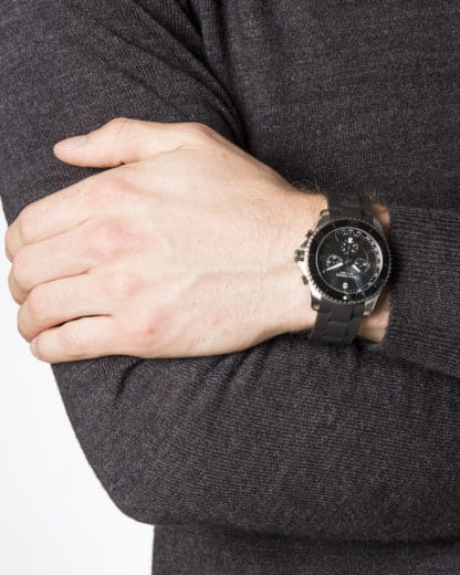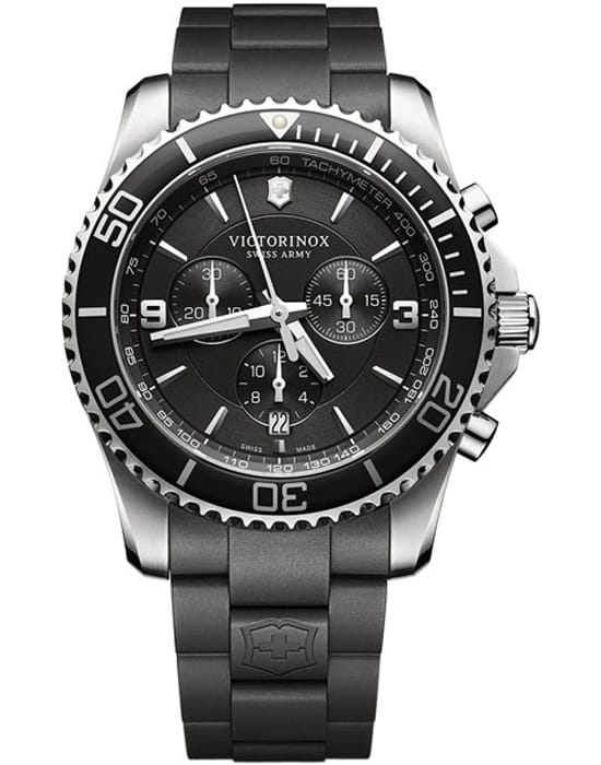 Мужские швейцарские часы- хронографХронографФункция позволяет измерять отрезки времени с особой точностью: часы, минуты, секунды. Верным признаком хронографа является наличие на циферблате 3 дополнительных окошек-счётчиков. Victorinox Maverick 241696, кварцевый механизм с высокой точностью. Сапфировое стеклоСапфировое стеклоПрочный и надёжный материал из кристалла сапфира синтетического происхождения, характеризующийся особой твёрдостью и устойчивостью к царапинам и повреждениям. с трёхслойным антибликовым покрытием. Часы с секундомеромСекундомерСекундоме́р — прибор, способный измерять интервалы времени с точностью до долей секунды. и тахиметромТахиметрРазмеченная шкала, располагается на ободке или безеле часов. Тахиметр позволяет рассчитать скорость на определённом участке пути, расстояние измеряется в километрах или милях.. Корпус часов выполнен из нержавеющей стали 316L. Вращающийся стальной безельБезельВнешний ободок, закрепляющий стекло. В спортивных часах так называется поворотное кольцо с делениями на циферблате, выполняет роль таймера – замеряет отрезки времени на шкале. Неподвижный безель – элемент декора. Однонаправленно вращающийся безель на дайверских часах позволяет фиксировать моменты погружения и выныривания на поверхность. с PVD-покрытиемPVDУльтратонкое покрытие наносится в технике вакуумного напыления, сочетает в себе нитрид титана особой прочности со слоем золота или оксида хрома. Несёт в себе декоративную или защитную функцию.. Стрелки с люминесцентным покрытиемЛюминесцентное покрытиеПозволяет считывать показания времени в темноте. Производители наносят на стрелки, часовые индексы, безель или поверхность циферблата светонакопительный состав, дающий холодное свечение.. Класс водозащиты: 100 метров, позволит плавать, нырять и заниматься другими водными видами спорта. Каучковый ремешок на стандартной застежке.