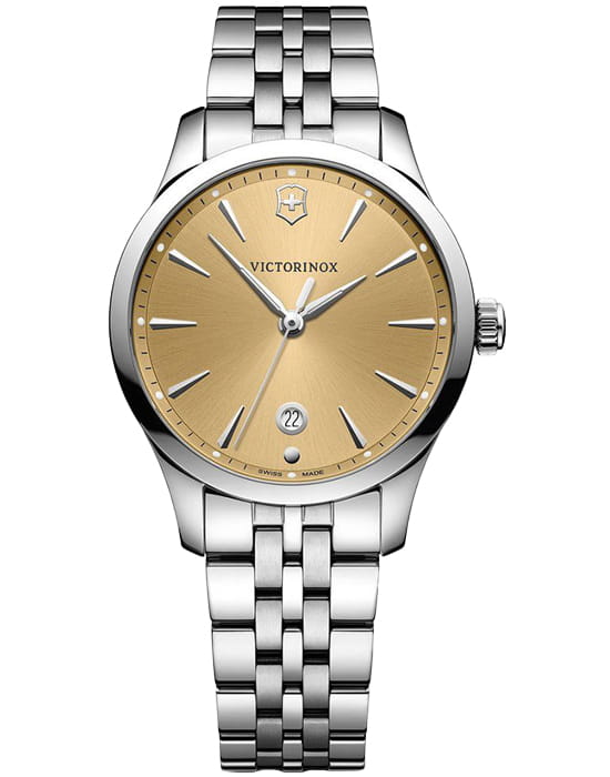 Женские швейцарские часы Victorinox 241829, кварцевый механизм с высокой точностью. Сапфировое стеклоСапфировое стеклоПрочный и надёжный материал из кристалла сапфира синтетического происхождения, характеризующийся особой твёрдостью и устойчивостью к царапинам и повреждениям. устойчивое к появлению царапин, обладающее высокой прозрачностью. Класс водозащиты: 100 метров, позволит плавать, нырять и заниматься другими водными видами спорта. Корпус часов изготовлен из нержавеющей стали 316L. Стрелки с люминесцентным покрытиемЛюминесцентное покрытиеПозволяет считывать показания времени в темноте. Производители наносят на стрелки, часовые индексы, безель или поверхность циферблата светонакопительный состав, дающий холодное свечение..