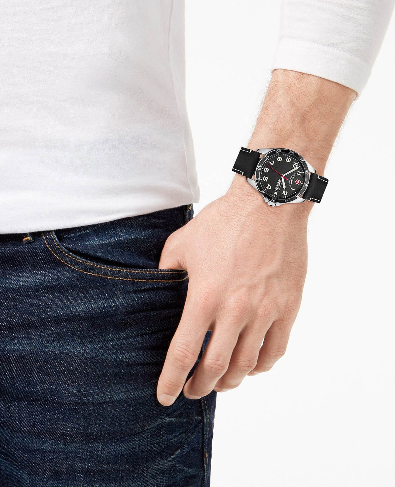 Мужские швейцарские часы Victorinox Fieldforce 241846 с надёжным кварцевым механизмом. Сапфировое стеклоСапфировое стеклоПрочный и надёжный материал из кристалла сапфира синтетического происхождения, характеризующийся особой твёрдостью и устойчивостью к царапинам и повреждениям. с трёхслойным антибликовым покрытием. Корпус часов выполнен из нержавеющей стали 316L. Практичный кожаный ремешок на стандартной застёжке. Влагозащита: 100 метров, позволит плавать, нырять и заниматься другими водными видами спорта. Окошко даты и дня недели находится в положении 3 часа. Стрелки и метки с люминесцентным покрытиемЛюминесцентное покрытиеПозволяет считывать показания времени в темноте. Производители наносят на стрелки, часовые индексы, безель или поверхность циферблата светонакопительный состав, дающий холодное свечение..