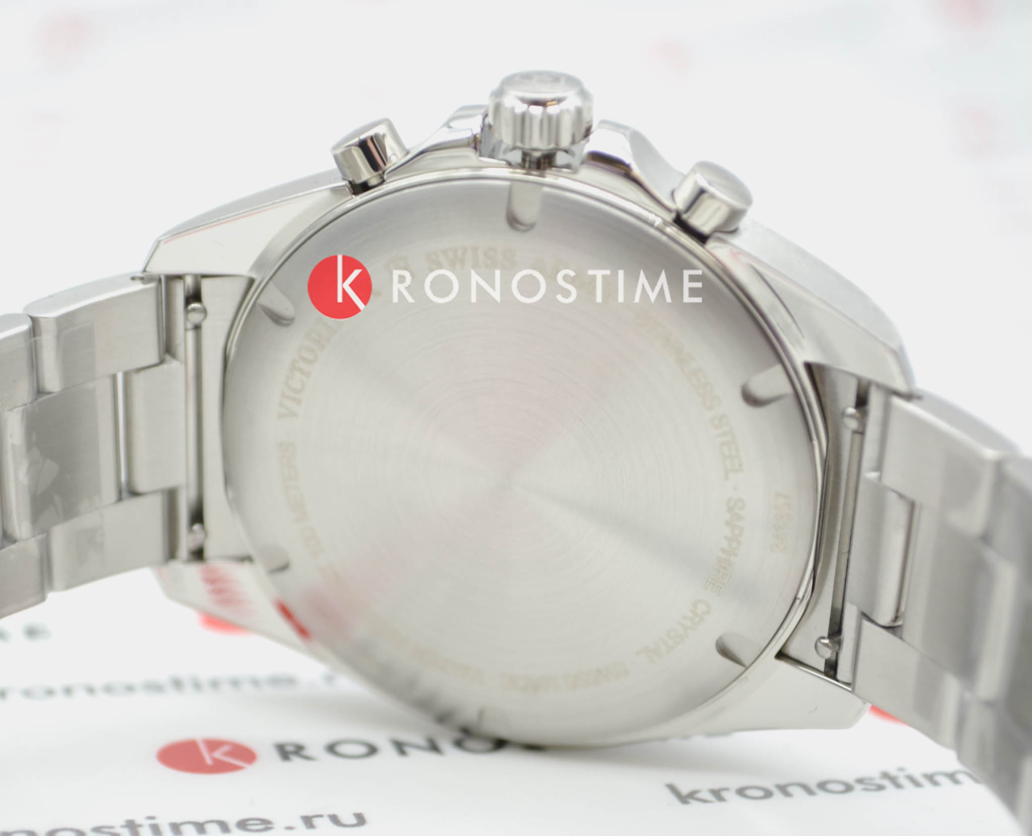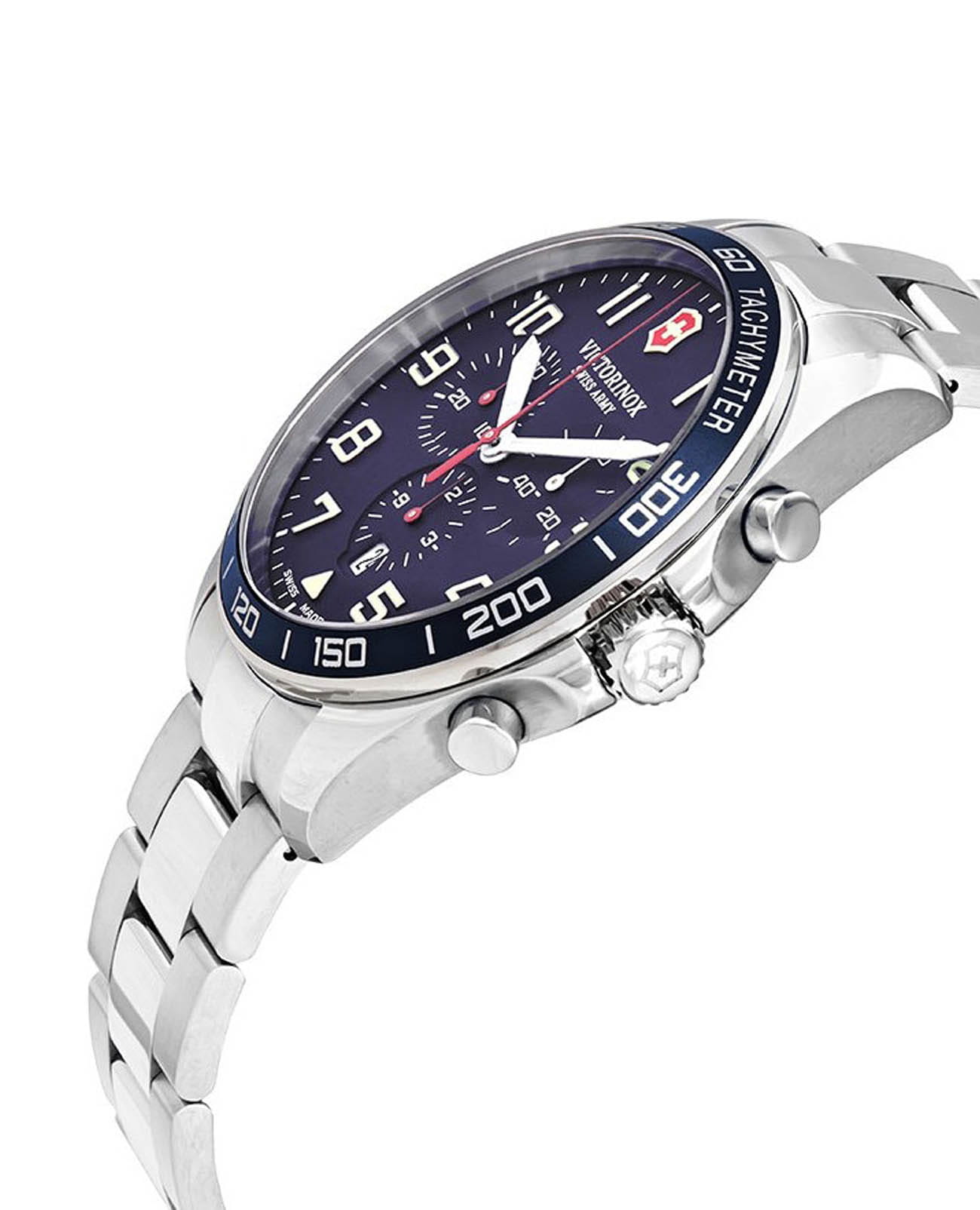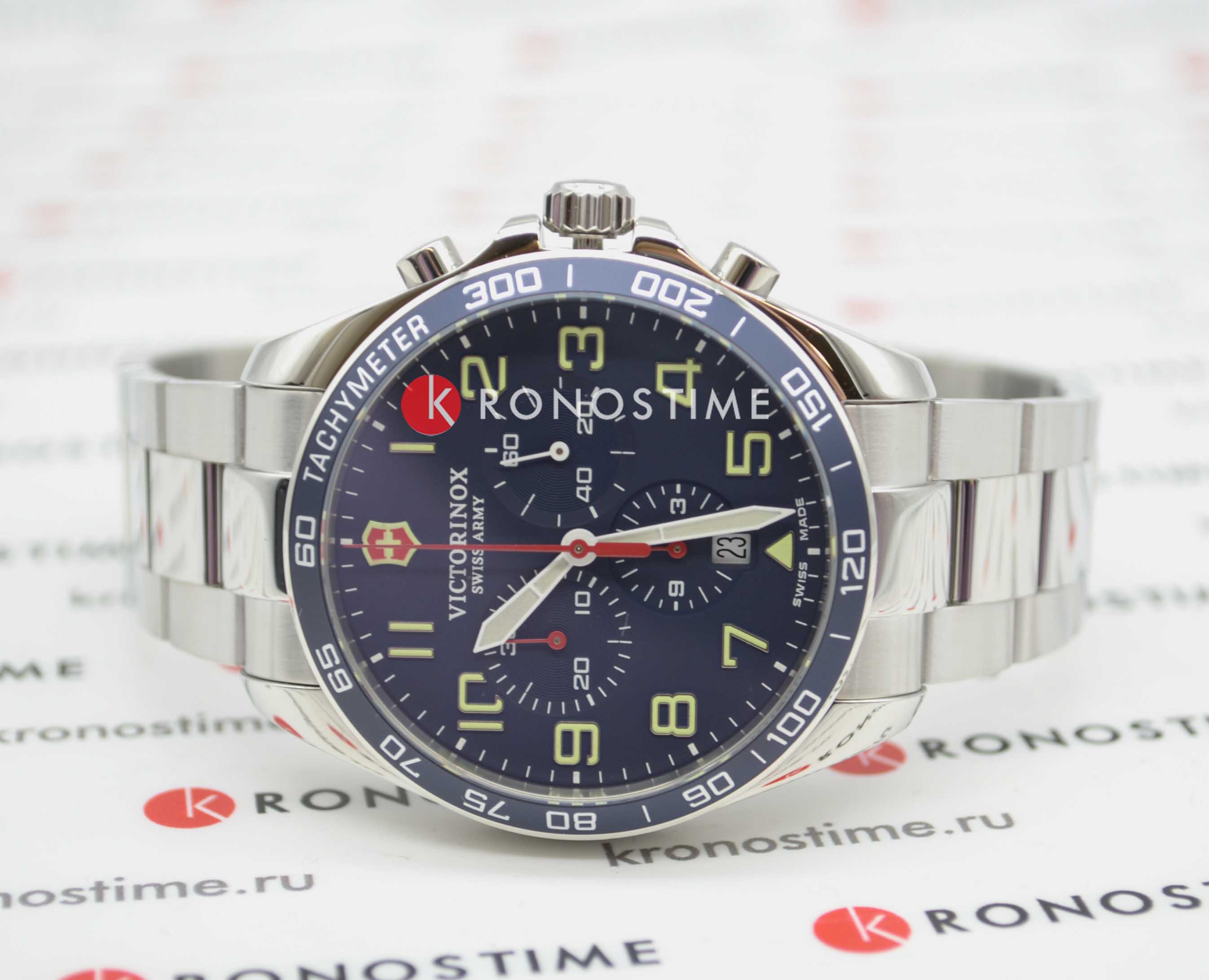 Мужские швейцарские часы-хронографХронографФункция позволяет измерять отрезки времени с особой точностью: часы, минуты, секунды. Верным признаком хронографа является наличие на циферблате 3 дополнительных окошек-счётчиков. Victorinox Fieldforce Chronograph 241857 с надёжным кварцевым механизмом. Сапфировое стеклоСапфировое стеклоПрочный и надёжный материал из кристалла сапфира синтетического происхождения, характеризующийся особой твёрдостью и устойчивостью к царапинам и повреждениям. с трёхслойным антибликовым покрытием. Корпус часов выполнен из нержавеющей стали 316L. Стальной браслет на раскладной застёжкеРаскладная застёжкаТакой тип застёжки используется только на браслетах из металла. Она никогда не раскрывается полностью, происходит разделение на 2 и более частей. Раскладывающая застёжка снизит вероятность потери часов к минимуму.. Влагозащита: 100 метров, позволит плавать, нырять и заниматься другими водными видами спорта. Окошко даты находится в положении 6 часов, стрелки и метки с люминесцентным покрытиемЛюминесцентное покрытиеПозволяет считывать показания времени в темноте. Производители наносят на стрелки, часовые индексы, безель или поверхность циферблата светонакопительный состав, дающий холодное свечение., тахиметрТахиметрРазмеченная шкала, располагается на ободке или безеле часов. Тахиметр позволяет рассчитать скорость на определённом участке пути, расстояние измеряется в километрах или милях..