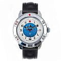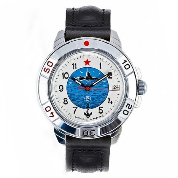 Российские механические часы. Корпус из высокопрочной стали с антикоррозийными свойствами. Ремешок из натуральной кожи черного цвета. Циферблат с символикой Подводных войск. Водонепроницаемость часов составляет 3 ATM. Минеральное стекло, устойчивое к появлению царапин.