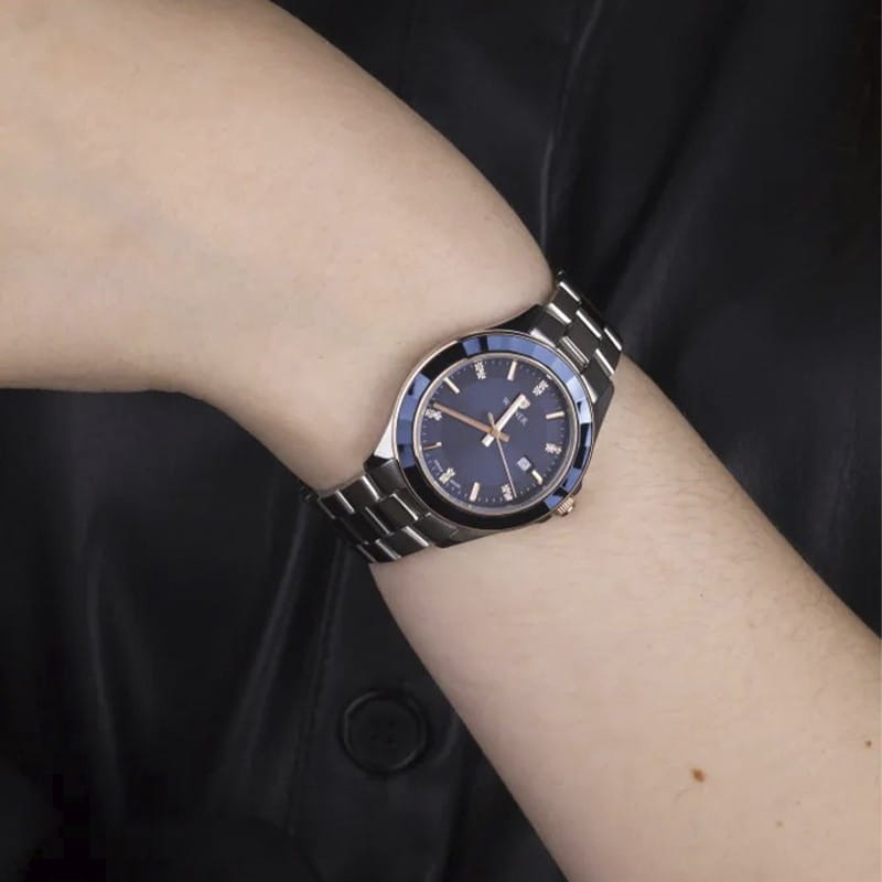 Циферблат защищен закаленным минеральным стекломМинеральное стеклоМинеральное стекло представляет собой искусственно выращенный минерал кварца. Такое стекло отличается особой устойчивостью к повреждениям и царапинам. Уступает по некоторым качествам сапфировому стеклу., что обеспечивает высокую устойчивость к царапинам и повреждениям. Окошко даты расположено в положении 3 часа, делая информацию максимально доступной. БезельБезельВнешний ободок, закрепляющий стекло. В спортивных часах так называется поворотное кольцо с делениями на циферблате, выполняет роль таймера – замеряет отрезки времени на шкале. Неподвижный безель – элемент декора. Однонаправленно вращающийся безель на дайверских часах позволяет фиксировать моменты погружения и выныривания на поверхность. с PVD-покрытиемPVDУльтратонкое покрытие наносится в технике вакуумного напыления, сочетает в себе нитрид титана особой прочности со слоем золота или оксида хрома. Несёт в себе декоративную или защитную функцию..