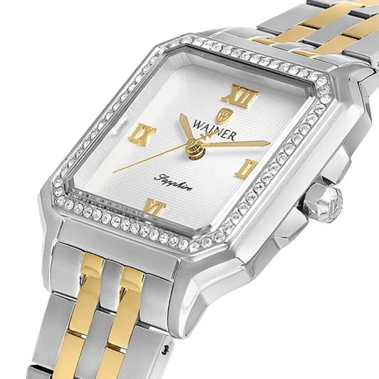 Женские кварцевые часы Wainer WA.18080-E — это изысканный аксессуар, воплощающий швейцарское качество и элегантность. Модель выполнена в квадратной форме из стали 316L, а её корпус украшен люминесцентным покрытиемЛюминесцентное покрытиеПозволяет считывать показания времени в темноте. Производители наносят на стрелки, часовые индексы, безель или поверхность циферблата светонакопительный состав, дающий холодное свечение. и инкрустирован кристаллами, что придаёт ему роскошный внешний вид. Циферблат серебристого цвета гильоширован и дополнен римскими цифрами, а секундная стрелка на конце декорирована буквой W, подчёркивая внимание к деталям. Защиту механизма обеспечивает сапфировое стеклоСапфировое стеклоПрочный и надёжный материал из кристалла сапфира синтетического происхождения, характеризующийся особой твёрдостью и устойчивостью к царапинам и повреждениям., устойчивое к повреждениям. Гранёная заводная головка с защитой оснащена фирменным логотипом, добавляя модели индивидуальности. Браслет из стали 316L с частичным PVD-покрытиемPVDУльтратонкое покрытие наносится в технике вакуумного напыления, сочетает в себе нитрид титана особой прочности со слоем золота или оксида хрома. Несёт в себе декоративную или защитную функцию. шириной 16 мм оснащён Раскладная застёжкаРаскладная застёжкаТакой тип застёжки используется только на браслетах из металла. Она никогда не раскрывается полностью, происходит разделение на 2 и более частей. Раскладывающая застёжка снизит вероятность потери часов к минимуму., обеспечивающей комфорт и надёжную фиксацию на запястье. Водонепроницаемость позволяет использовать модель при мытье рук или под лёгким дождём. Механизм калибра Ronda 763 гарантирует точность хода и надёжность. Эти часы станут универсальным аксессуаром для тех, кто ценит сочетание стиля, функциональности и швейцарского мастерства — идеальный выбор для повседневной носки и торжественных случаев.
