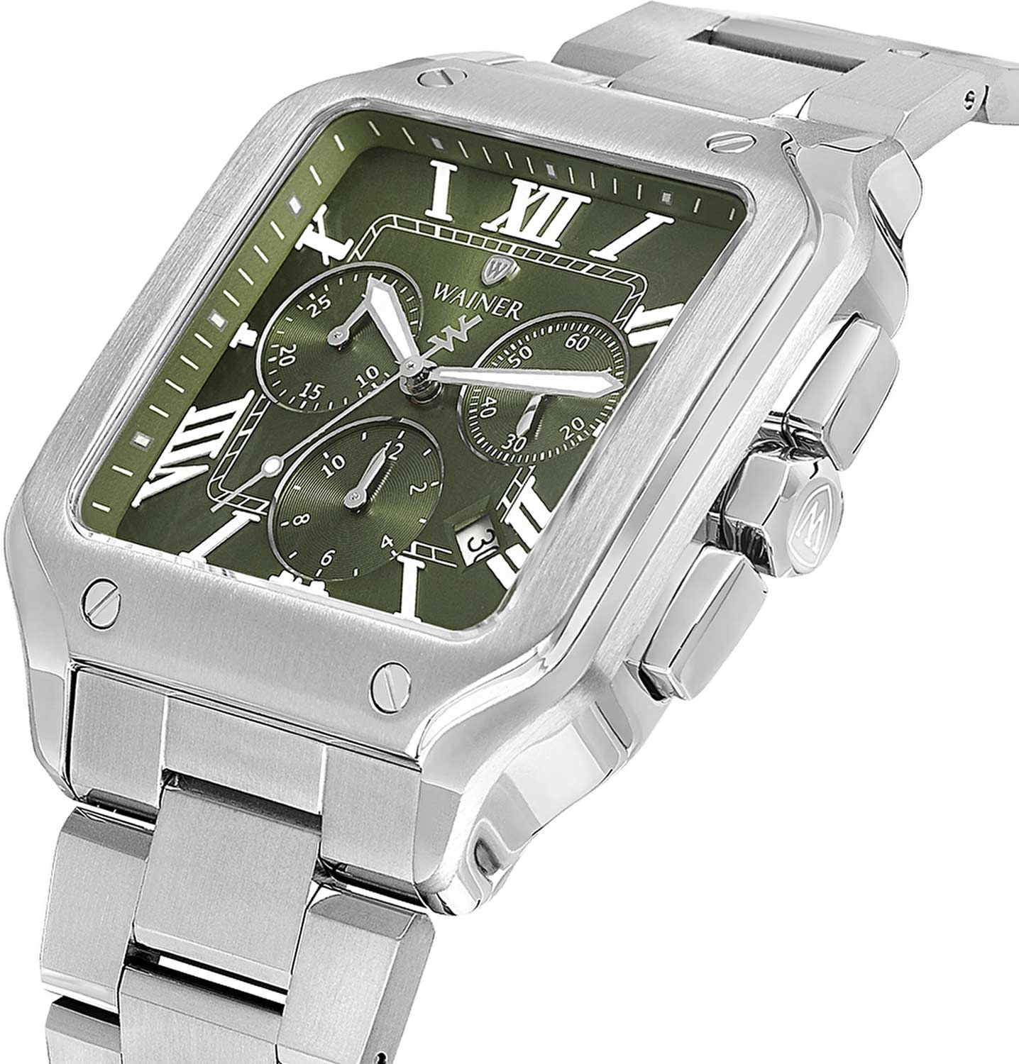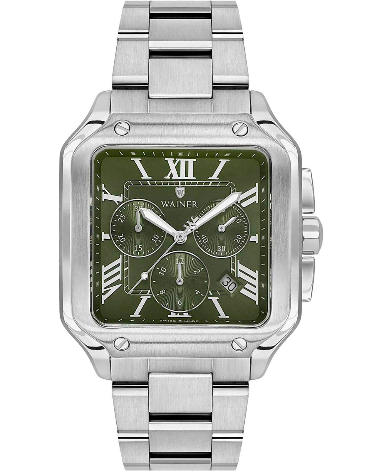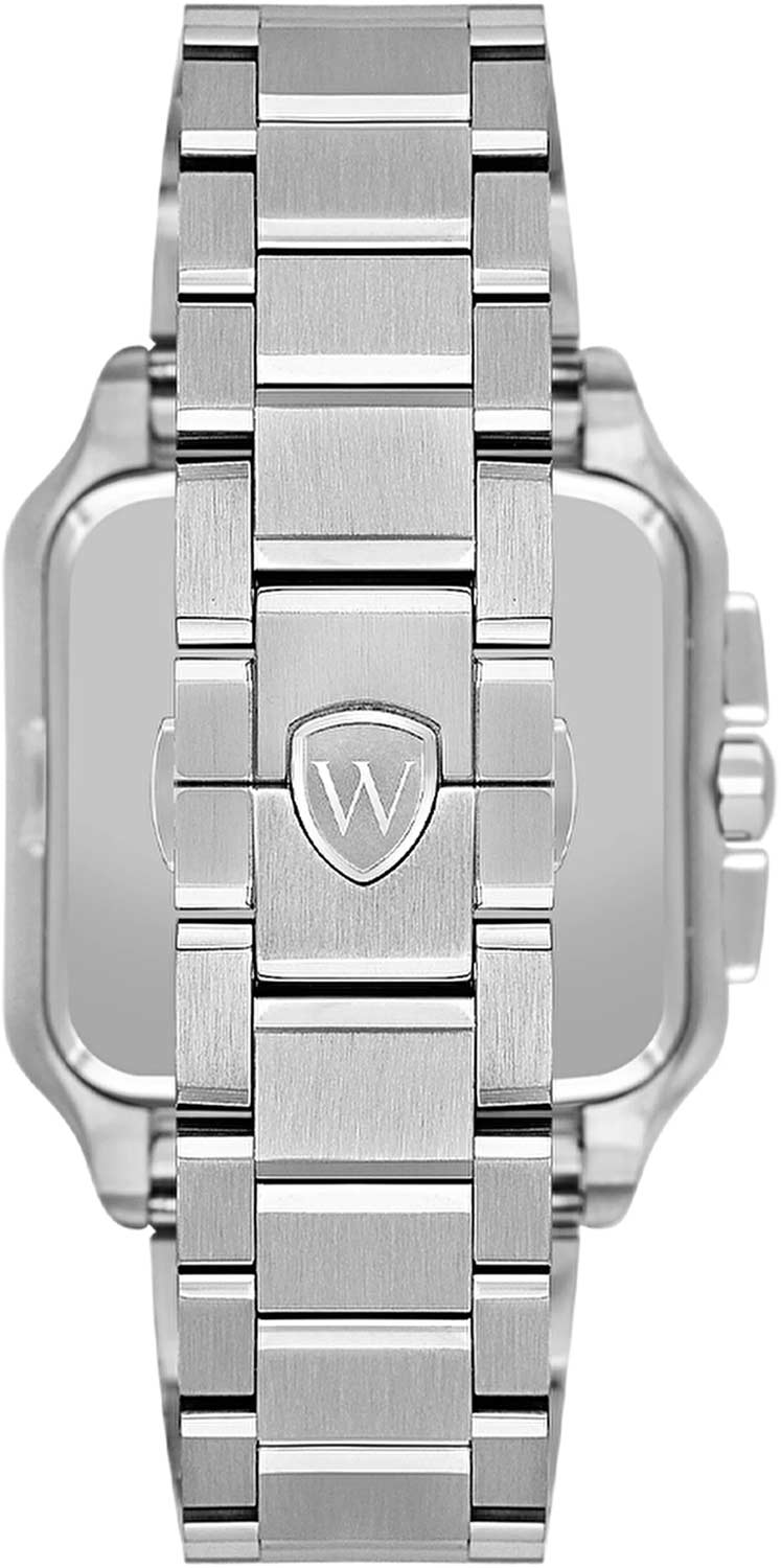 Мужские кварцевые часы Wainer WA.18090-B — это стильный аксессуар, сочетающий в себе швейцарское качество и изысканный дизайн. Модель выполнена в квадратной форме из стали 316L с декоративными винтами, что придаёт ей прочность и устойчивость к царапинам. Циферблат дополнен штриховыми метками и римскими цифрами, а секундная стрелка на конце декорирована буквой W, подчёркивая внимание к деталям. Защиту механизма обеспечивает сапфировое стеклоСапфировое стеклоПрочный и надёжный материал из кристалла сапфира синтетического происхождения, характеризующийся особой твёрдостью и устойчивостью к царапинам и повреждениям., устойчивое к повреждениям. Окошко даты расположено в положении 4 часов, а гранёная заводная головка с защитой оснащена фирменным логотипом, добавляя модели индивидуальности. Браслет из стали 316L шириной 22 мм оснащён Раскладная застёжкаРаскладная застёжкаТакой тип застёжки используется только на браслетах из металла. Она никогда не раскрывается полностью, происходит разделение на 2 и более частей. Раскладывающая застёжка снизит вероятность потери часов к минимуму., обеспечивающей комфорт и надёжную фиксацию на запястье. Водонепроницаемость позволяет использовать модель при мытье рук или под лёгким дождём. Стрелки с люминесцентным покрытиемЛюминесцентное покрытиеПозволяет считывать показания времени в темноте. Производители наносят на стрелки, часовые индексы, безель или поверхность циферблата светонакопительный состав, дающий холодное свечение. обеспечивают отличную читаемость даже в условиях слабого освещения. Механизм калибра Ronda 5030.D гарантирует точность хода и надёжность. Эти часы станут универсальным аксессуаром для тех, кто ценит сочетание стиля, функциональности и швейцарского мастерства — идеальный выбор для повседневной носки и торжественных случаев.