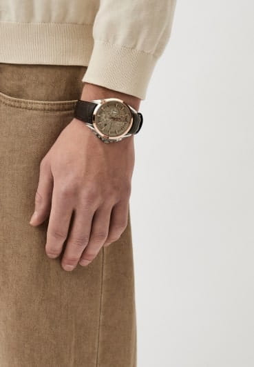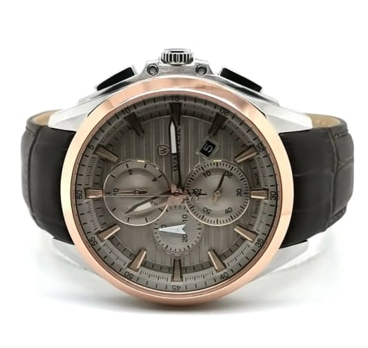 Модель Wainer WA.19400-D сочетает элегантность, швейцарское качество и функциональность. Корпус диаметром 43 мм выполнен из нержавеющей стали 316L, обеспечивающей прочность и долговечность. БезельБезельВнешний ободок, закрепляющий стекло. В спортивных часах так называется поворотное кольцо с делениями на циферблате, выполняет роль таймера – замеряет отрезки времени на шкале. Неподвижный безель – элемент декора. Однонаправленно вращающийся безель на дайверских часах позволяет фиксировать моменты погружения и выныривания на поверхность. с PVD-покрытиемPVDУльтратонкое покрытие наносится в технике вакуумного напыления, сочетает в себе нитрид титана особой прочности со слоем золота или оксида хрома. Несёт в себе декоративную или защитную функцию.. Циферблат оформлен в классическом стиле и оснащен хронографомХронографФункция позволяет измерять отрезки времени с особой точностью: часы, минуты, секунды. Верным признаком хронографа является наличие на циферблате 3 дополнительных окошек-счётчиков. для точного измерения времени, а сапфировое стеклоСапфировое стеклоПрочный и надёжный материал из кристалла сапфира синтетического происхождения, характеризующийся особой твёрдостью и устойчивостью к царапинам и повреждениям. защищает дисплей от царапин и механических повреждений. Часы работают на надежном кварцевом механизме, обеспечивающем стабильную точность. Натуральный кожаный ремешок гарантирует комфортное ношение и элегантный внешний вид. Водонепроницаемость до 50 метров защищает часы от случайных брызг. Wainer WA.19400-D — это стильный аксессуар для мужчин, ценящих швейцарскую точность, современный стиль и функциональность.