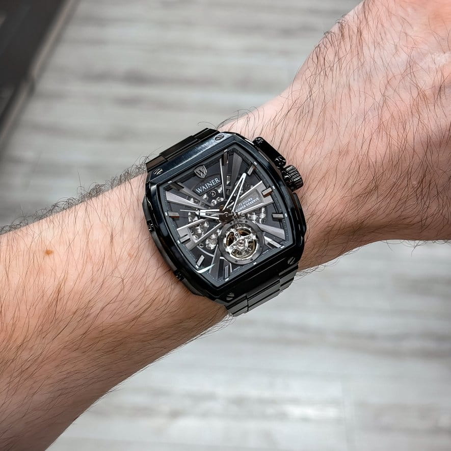 Мужские механические часы-скелетон с автоподзаводом Wainer WA.25150-A сочетает элегантный дизайн и высокое качество исполнения. Бочкообразный корпус выполнен из нержавеющей стали с PVD-покрытиемPVDУльтратонкое покрытие наносится в технике вакуумного напыления, сочетает в себе нитрид титана особой прочности со слоем золота или оксида хрома. Несёт в себе декоративную или защитную функцию. черного цвета, диаметром 46 х 47мм и толщиной 14 мм, обеспечивает прочность и долговечность. Циферблат с метками в виде штрихов и украшен фирменным логотипом Wainer. Сапфировое стеклоСапфировое стеклоПрочный и надёжный материал из кристалла сапфира синтетического происхождения, характеризующийся особой твёрдостью и устойчивостью к царапинам и повреждениям. защищает дисплей от царапин и механических повреждений. Стальной браслет с PVD-покрытиемPVDУльтратонкое покрытие наносится в технике вакуумного напыления, сочетает в себе нитрид титана особой прочности со слоем золота или оксида хрома. Несёт в себе декоративную или защитную функцию. на застёжке-бабочкеЗастёжка "бабочка"Такой вид застёжки дополняется предохранителями, помогающими избежать случайного раскрытия браслета. Обладают изящным исполнением. обеспечивает комфортное ношение. Водонепроницаемость до 30 метров позволит защитить корпус от случайных брызг или капель дождя. Стрелки с люминесцентным покрытиемЛюминесцентное покрытиеПозволяет считывать показания времени в темноте. Производители наносят на стрелки, часовые индексы, безель или поверхность циферблата светонакопительный состав, дающий холодное свечение., улучшая читаемость в условиях недостаточного освещения. Рифленая заводная головка с защитой. Прозрачная задняя крышка. Wainer — это стильный и надежный аксессуар для тех, кто ценит швейцарское качество и современные технологии.