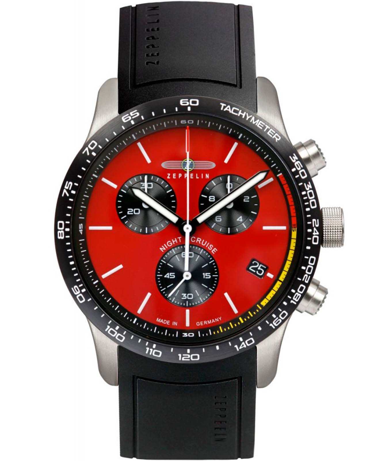 Мужские наручные часы-хронографХронографФункция позволяет измерять отрезки времени с особой точностью: часы, минуты, секунды. Верным признаком хронографа является наличие на циферблате 3 дополнительных окошек-счётчиков. Zeppelin Night Cruise 72885 КВ сочетают в себе классический дизайн и надежность современных технологий. Модель обладает круглым корпусом, изготовленным из нержавеющей стали, что обеспечивает высокую устойчивость к внешним воздействиям. БезельБезельВнешний ободок, закрепляющий стекло. В спортивных часах так называется поворотное кольцо с делениями на циферблате, выполняет роль таймера – замеряет отрезки времени на шкале. Неподвижный безель – элемент декора. Однонаправленно вращающийся безель на дайверских часах позволяет фиксировать моменты погружения и выныривания на поверхность. с IP-покрытиемIP-покрытиеМетод ионного напыления. Демонстрирует повышенную устойчивость к истиранию, окислению и химическим веществам. Под воздействием высокого давления и температуры около 1500°C молекулы металла надёжно соединяются с частицами корпуса часов.. Силиконовый ремешок на стандартной застежке, гарантирующей комфортное ношение и безопасность. Красный циферблат оснащен стрелками оригинальной формы с люминесцентным покрытиемЛюминесцентное покрытиеПозволяет считывать показания времени в темноте. Производители наносят на стрелки, часовые индексы, безель или поверхность циферблата светонакопительный состав, дающий холодное свечение., которые делают часы особенно привлекательными. Для защиты используется минеральное стеклоМинеральное стеклоМинеральное стекло представляет собой искусственно выращенный минерал кварца. Такое стекло отличается особой устойчивостью к повреждениям и царапинам. Уступает по некоторым качествам сапфировому стеклу., обеспечивающее прочную защиту от царапин. Часы работают на кварцевом механизме, что гарантирует точное время без необходимости подзаводки. Водонепроницаемость часов достигает 100 метров, которая позволит плавать, нырять и заниматься другими водными видами спорта.