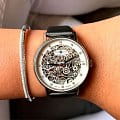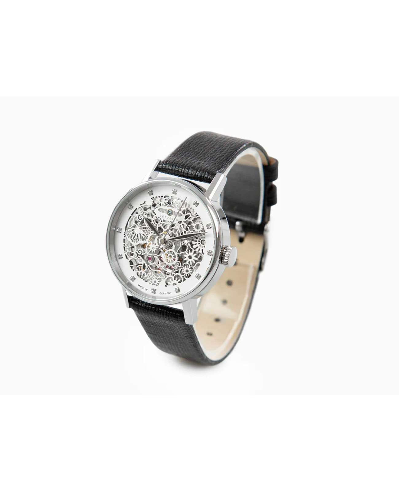 Женские наручные часы Zeppelin Princess of the Sky 7461-1 представляют собой изысканный скелетонизированный дизайн, где механизм украшен сверкающими кристаллами Swarovski. Модель обладает круглым корпусом диаметром 36 мм, изготовленным из нержавеющей стали, что обеспечивает высокую устойчивость к внешним воздействиям. Браслет выполнен из качественной текстурированной кожи, контрастирующей с металлическими элементами. Для защиты механизма используется минеральное стеклоМинеральное стеклоМинеральное стекло представляет собой искусственно выращенный минерал кварца. Такое стекло отличается особой устойчивостью к повреждениям и царапинам. Уступает по некоторым качествам сапфировому стеклу. с антибликовое покрытиеАнтибликовое покрытиеСлой оксида металла в 0,13-0,3 микрон, благодаря которому стекло часов не бликует и не отражает свет. Антибликовое покрытие уменьшает отражение света в 10 раз, обеспечивая отличную читаемость показателей циферблата., обеспечивающее прочную защиту от царапин и оптимальную видимость циферблата. Часы работают на автоматическом механизме, заряжаемом за счет естественного движения руки пользователя, что делает их автономными в использовании.  Водонепроницаемость часов составляет 5 атмосфер (50 метров), что позволяет использовать их в повседневных условиях, однако не рекомендуется для плавания или дайвинга. Эта модель отличается своей элегантностью и станет прекрасным дополнением как к повседневному, так и к вечернему образу.